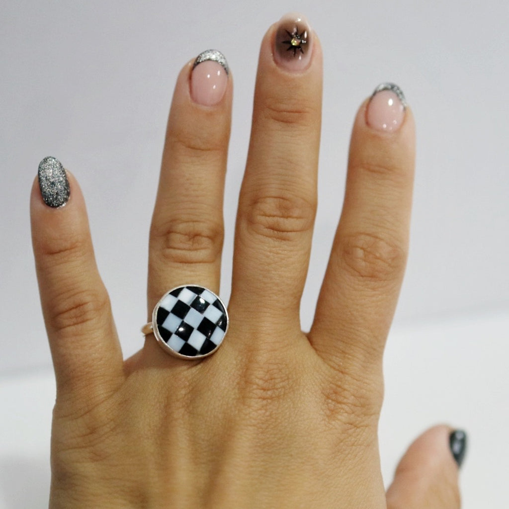 Black and White Checkered Gemstone Ring in Sterling Silver